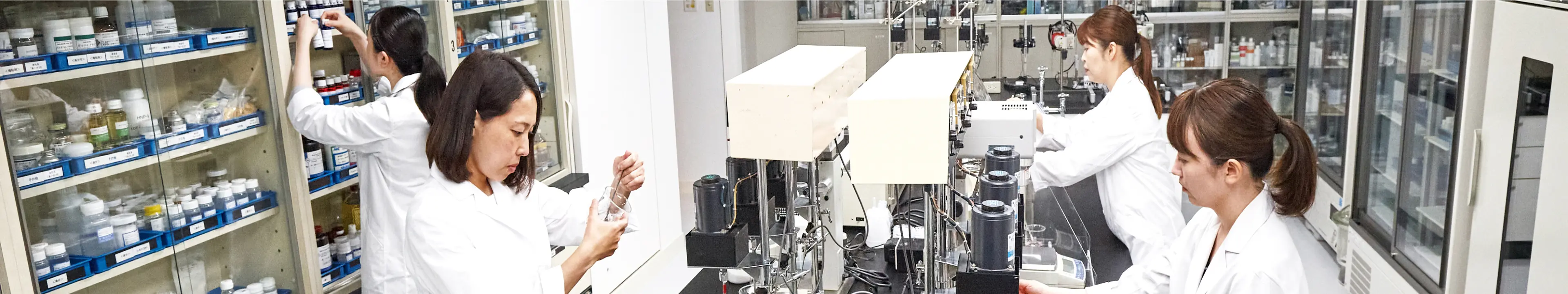 研究所は「基礎研究」「コース開発」「化粧品・健康食品開発」「美容機器開発」の4つの部門に分かれており、それぞれの専門家が知識と技術を活かして開発に取り組んでいます。外部試験機関とも提携し、科学的根拠に基づいた安全性と有効性を検証することで、お客様に信頼できるエステティックを提供しています。また、お客様と直接関わるエステティシャンからの意見を迅速に取り入れることで、お客様が求める商品と技術の向上に努めております。