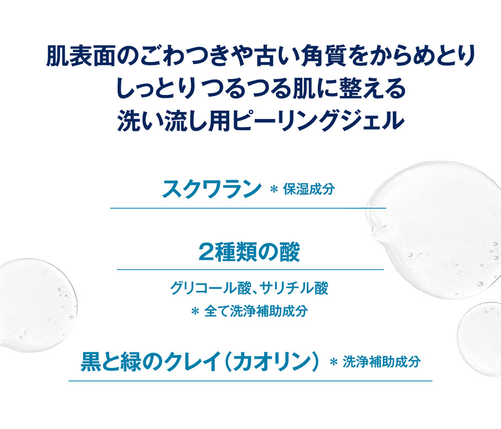 洗顔または洗浄後、手のひらに適量(2~3プッシュ)をとり、目や唇のまわりを避けて気になる部分に塗布し、円を描くようにやさしくマッサージします。ポロポロとしたものが出てきたら、水またはぬるま湯で十分に洗い流してください。