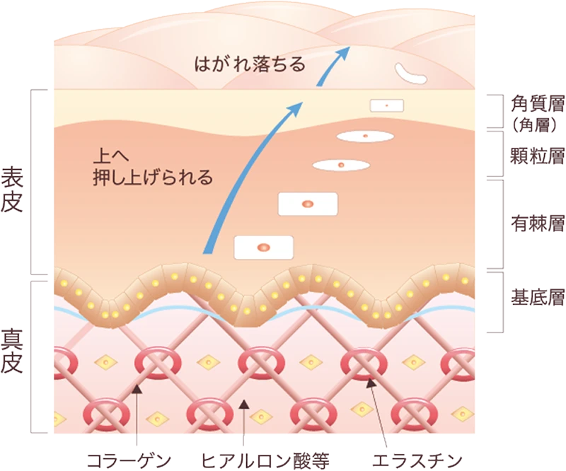 基底層で生まれた細胞が角質層まで押し上げられ、はがれ落ちるまでに一定期間かかります。その過程でエステティックを定期的に行なうことが、健康的な肌作りへとつながります。